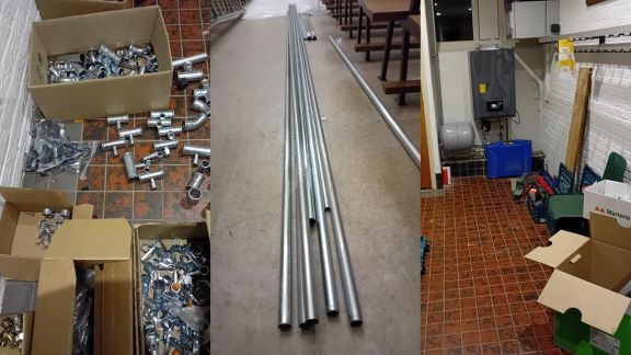Op maandag 3 november is fa. DRS begonnen met het plaatsen van radiatoren in de kerkzaal. Een stevige klus die, zo is de verwachting, wel een paar weken gaat duren. Heel veel koppelingen en meterslange verwarmingsbuizen versieren de hal en kerkzaal momenteel. De eerste 4 radiatoren, van de in totaal 9 die er geplaatst gaan worden, hangen op hun plaats. Radiatoren van elk 3 meter lang! Van een aantal banken moest nog een (klein) stukje worden afgezaagd om plaats te maken voor de radiatoren, 3 mannen van de klusploeg hebben dit met de handzagen gefikst!