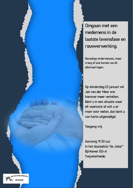 Op donderdag 22 januari komt Jan van der Meer in dorpshuis “de Jister” om meer te vertellen over, hoe om te gaan met een medemens die in de laatste levensfase verkeerd en rouwverwerking.