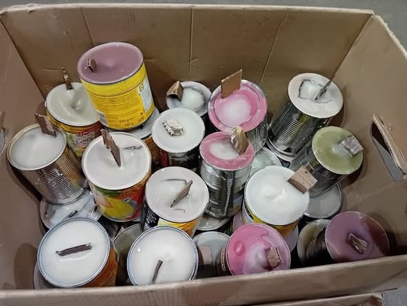 (op de foto conservenblikjes met daarin het omgesmolten kaarsvet)